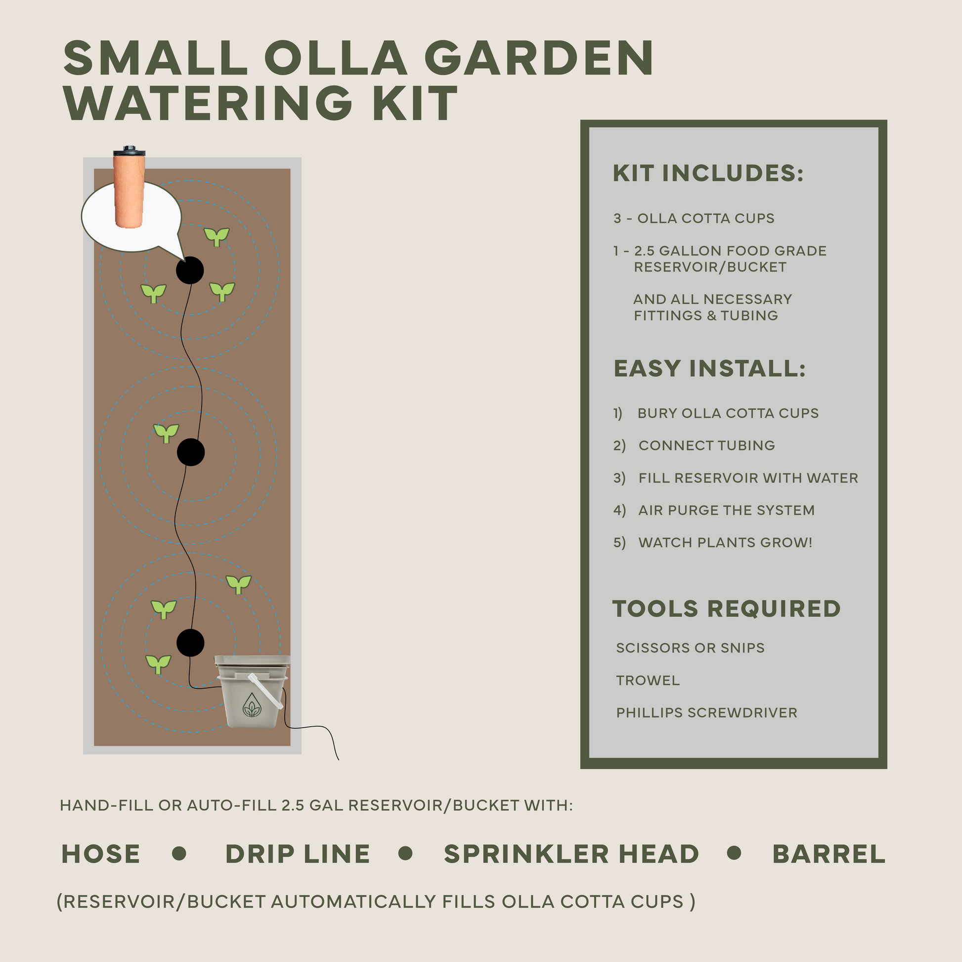 - Small - 3 Ollas & 2.5 gallon food grade reservoir/bucket