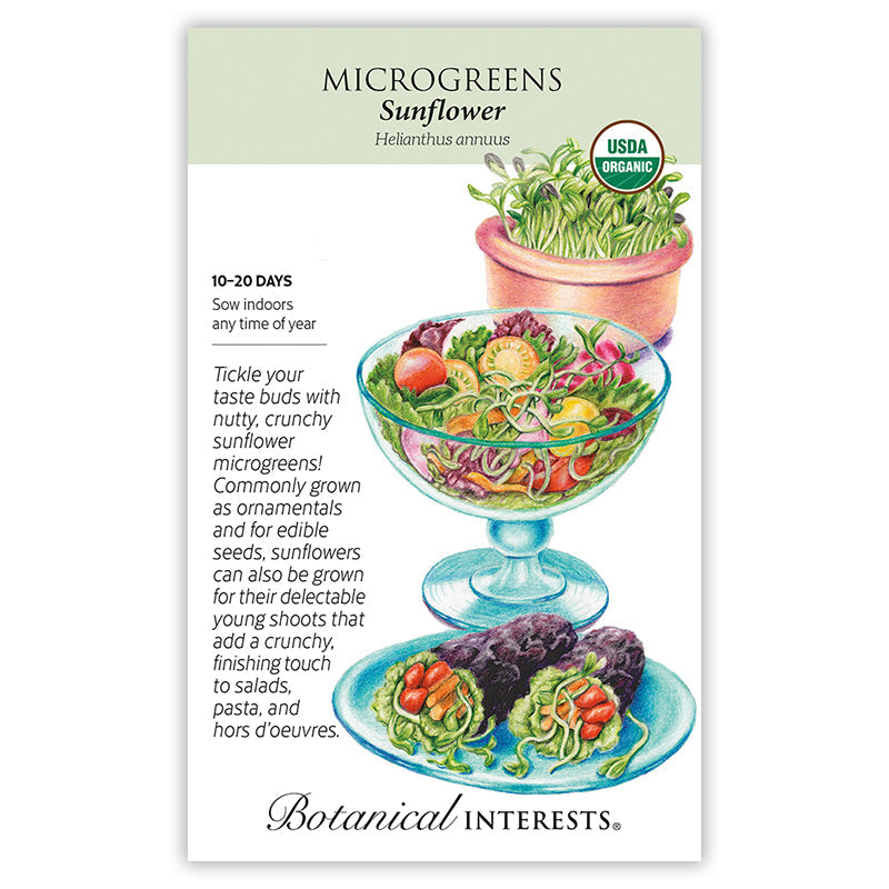 Harvesting: When seedlings emerge, the first pair of leaves to show are the cotyledons, which can look very different from the leaves that follow, called "true" leaves. Microgreens are ready to harvest when they have cotyledons, or when the first true leaves have begun to form, depending on preference. Cool growing temperatures may slow the expected amount of days to maturity. Using scissors, cut microgreens just above the soil line when you are ready to use them.