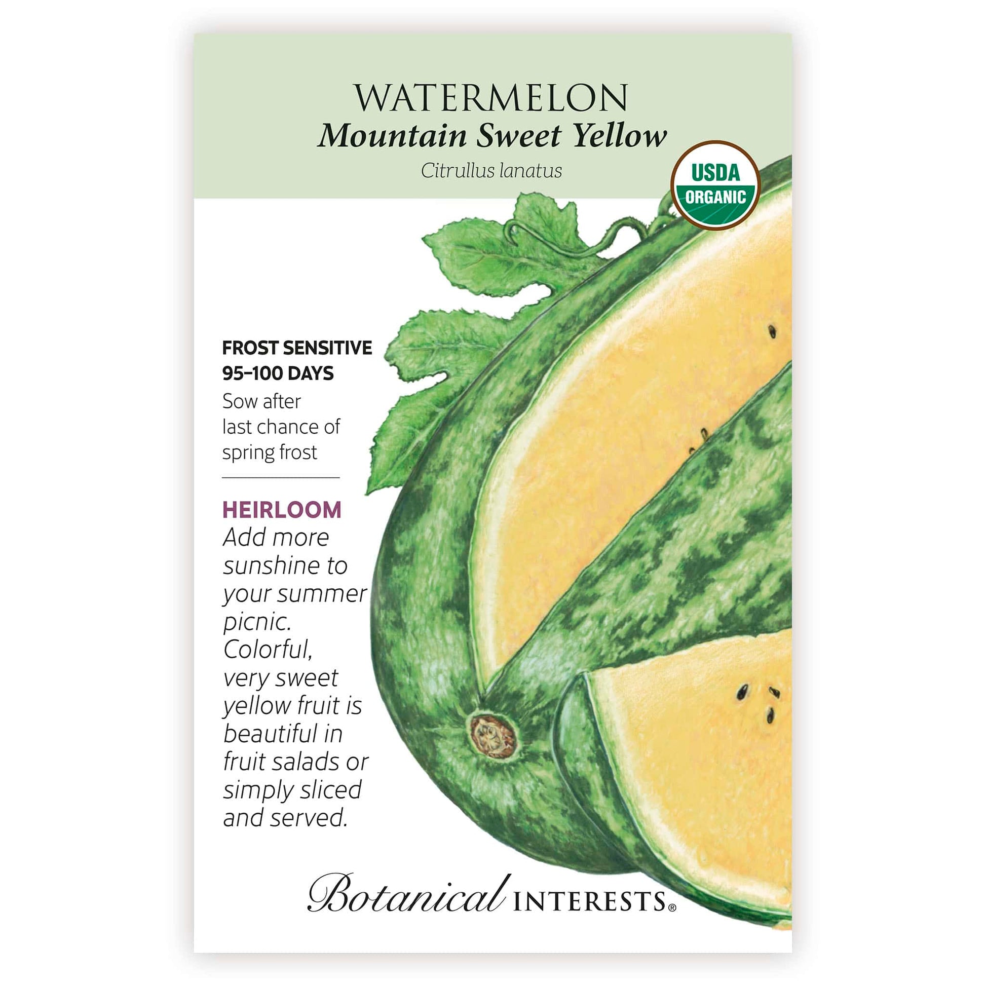 Variety Info: Mountain Sweet Yellow' produces oblong fruits that average 20–35 pounds. Outer rind is dark green with lighter green stripes. The yellow interior is firm and sweet.