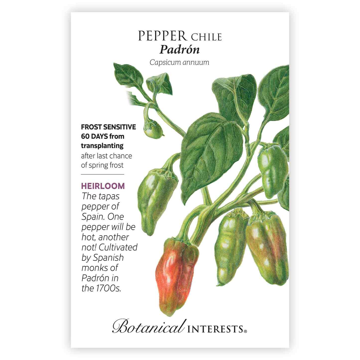 Variety Info: 1"–3" long ripening from green to red at maturity. Blocky shape when small, becoming more elongated and spicier as they mature. 'Padron' is a mild pepper ranging from 500–2,500 Scoville heat units, making some of them almost as hot as some jalapenos. Most 'Padron' peppers are mild when small and develop their heat as they mature, but about 5%–10% can be hot when harvested small. they can vary in size and shape from long and smooth to curved and grooved.