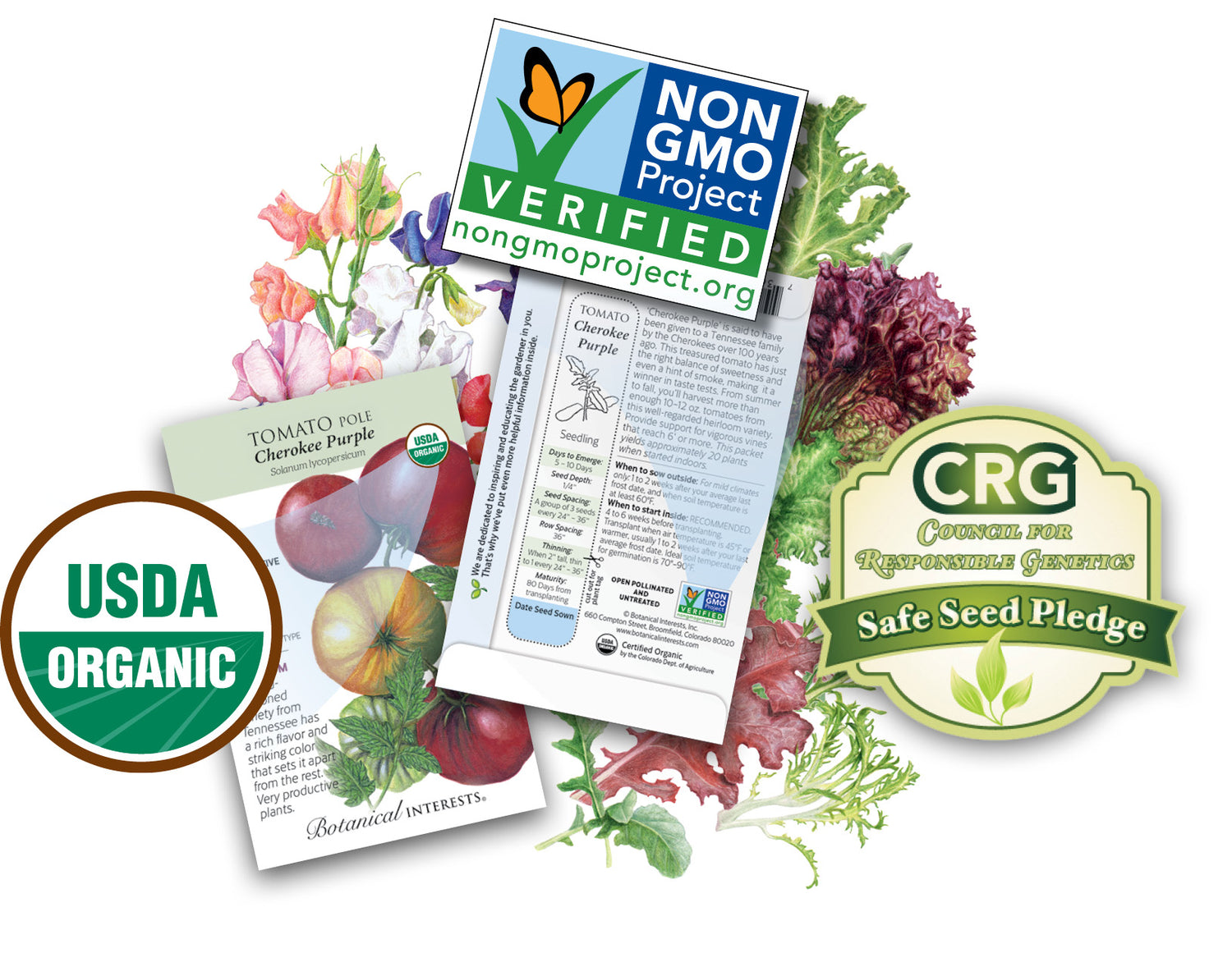 As organic gardeners ourselves, we wanted to make organic gardening accessible by providing easy-to-follow organic gardening advice and an ever-expanding selection of organic varieties. We were early signers of the Safe Seed Pledge which states "...we do not knowingly buy, sell, or trade genetically-engineered seeds or plants" and our seeds are tested by the Non-GMO Verified Project which looks for genetically engineered (GMO) contamination in seeds that can occur when plants cross-pollinate. Our seeds are not treated, and our packets never contain fillers—just high-quality seeds you can count on.