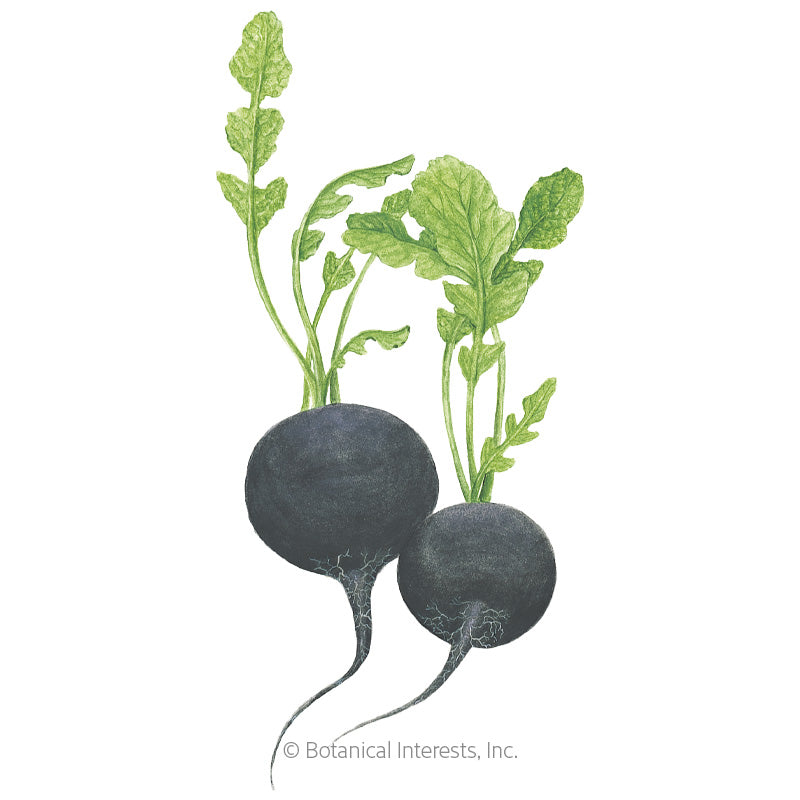 Variety Info: 3"–4" diameter, black skin with white interior. 'Round Black Spanish' is a medium-spicy radish.