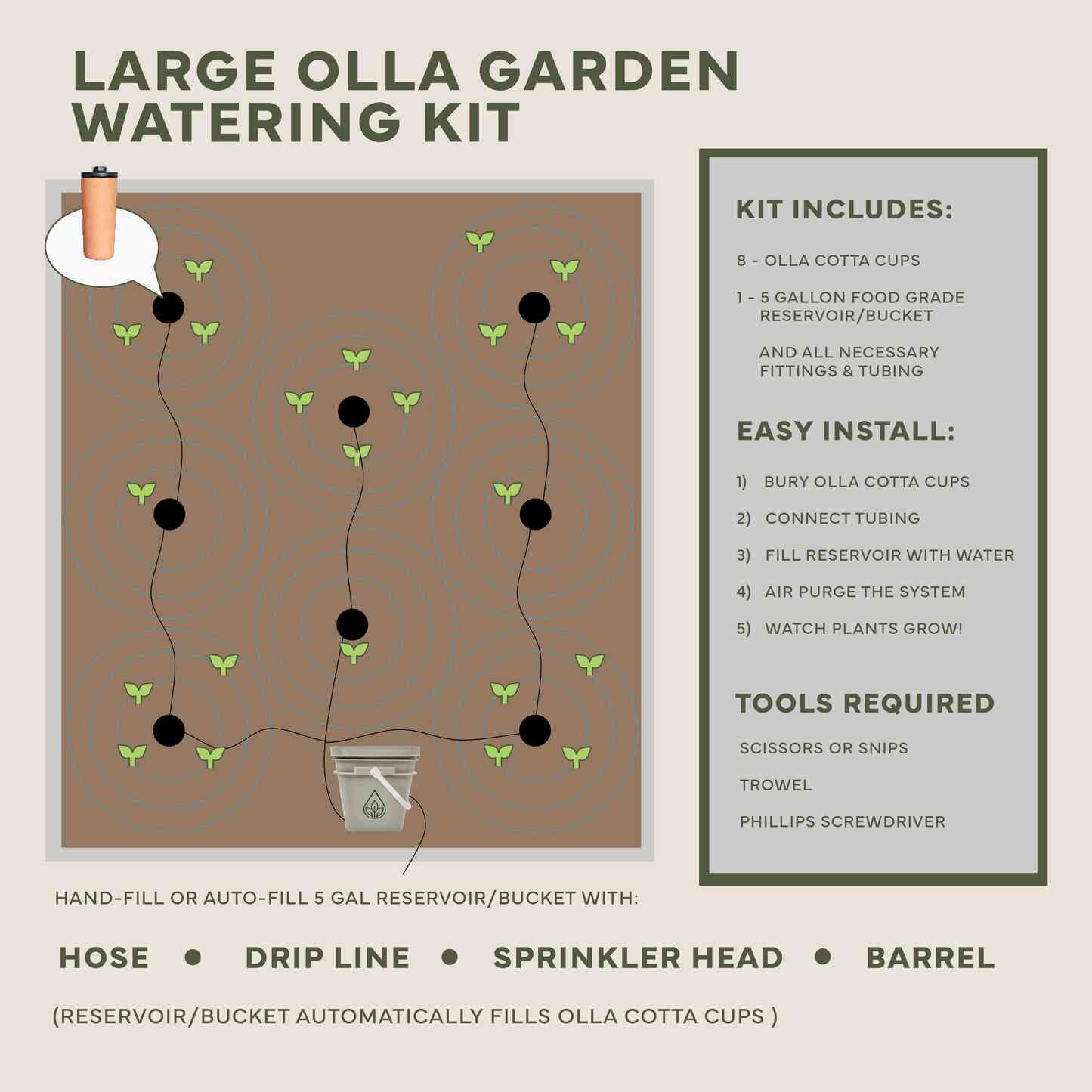 - Large - 8 Ollas & 5 gallon food grade reservoir/bucket