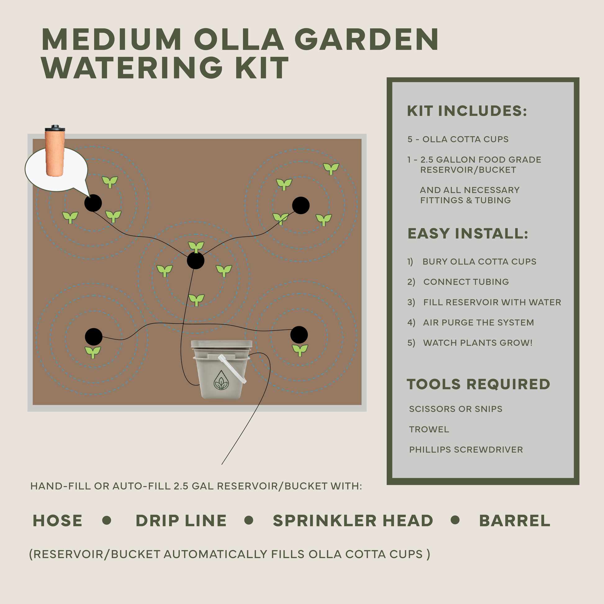 - Medium - 5 Ollas & 2.5 gallon food grade reservoir/bucket